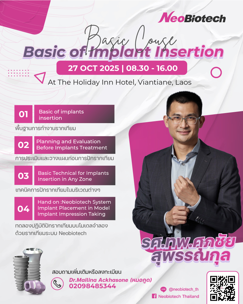 - คอร์สเรียนรู้การฝังรากเทียมแบบพื้นฐาน (Lecture + Hands-on + Live Surgery ทำเคสในคนไข้จริง)
